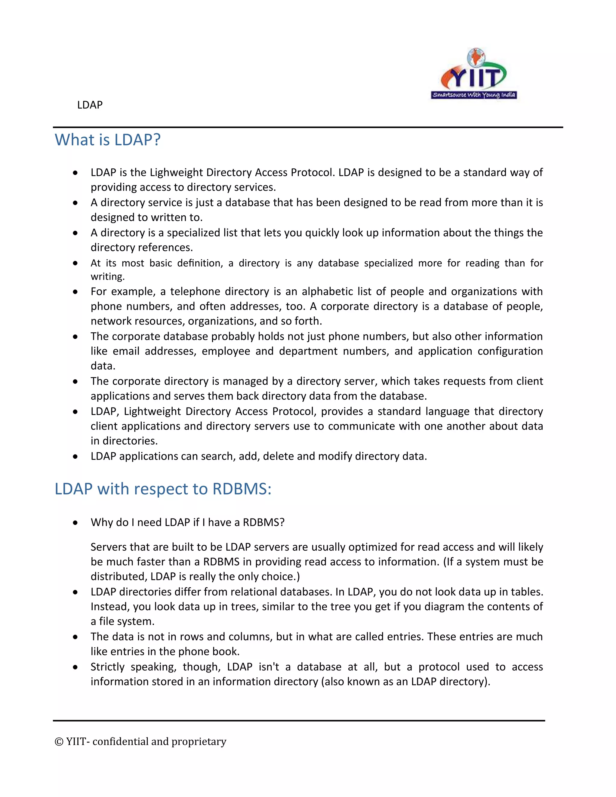 LDAP (Lightweight Directory Access Protocol) is a standard protocol for accessing directory services like telephone directories or corporate directories. It allows client applications to search, add, delete, and modify directory data stored on LDAP directory servers. LDAP directories organize data in a hierarchical tree structure of entries composed of attributes and their values, rather than in rows and columns like a relational database. Common operations on LDAP directories include binding, searching, comparing, adding, deleting, modifying, and renaming directory entries.