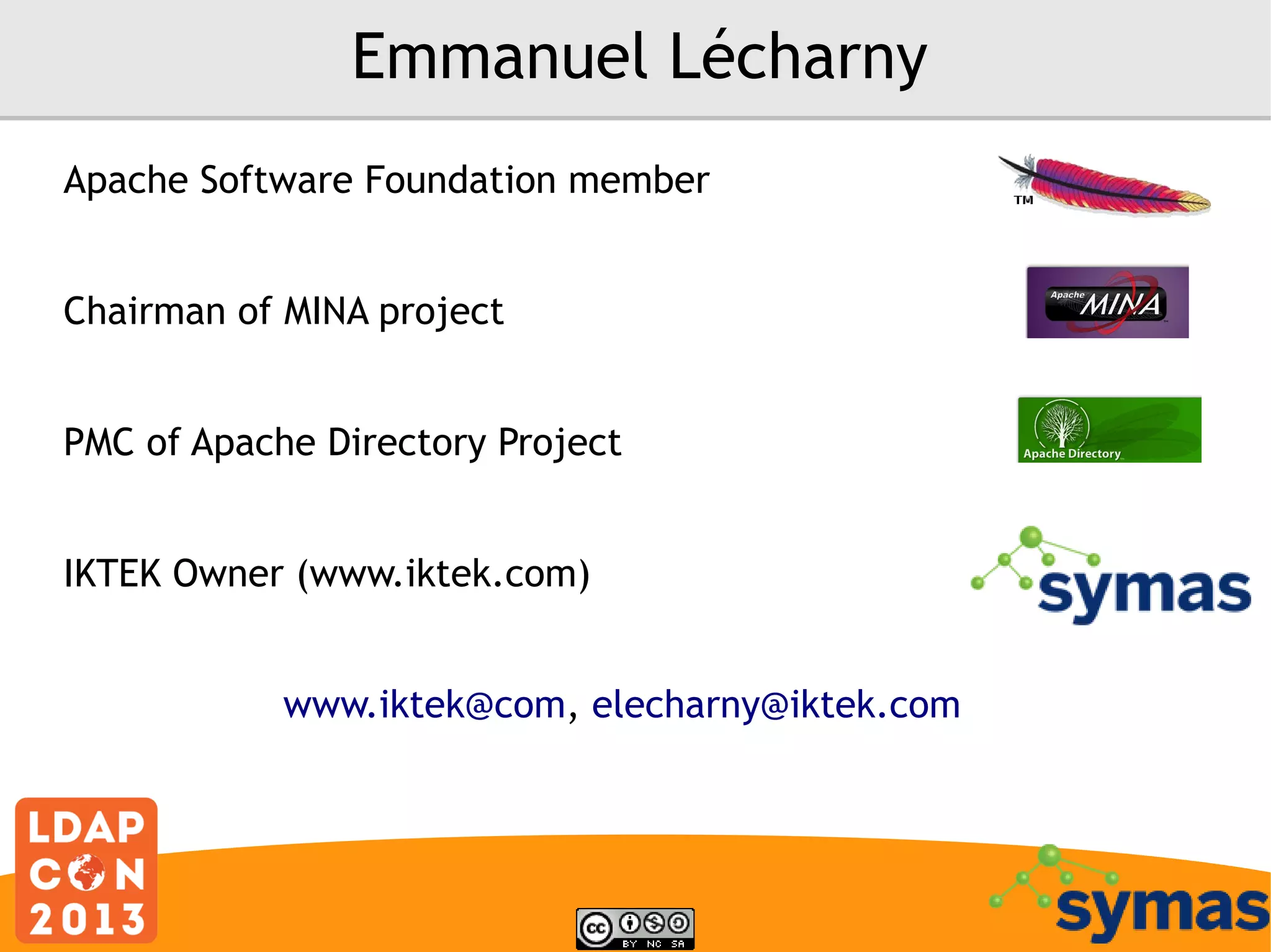 The document discusses different types of backends that can be used to store directory data in LDAP servers. It describes in-memory, LDIF, B-tree, MVCC, RDBMS, and NoSQL backends. Each backend has different performance, size, cost and reliability characteristics that make them suitable for different use cases like caching, tests, or storing very large directories.