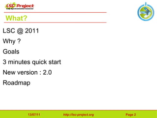 The document discusses LDAP Synchronization Connector (LSC), an open source project for automatically synchronizing user identity data across different identity repositories like LDAP directories and databases. LSC can read/write to any repository using standard protocols, transform data on-the-fly, and adjust synchronization options. It aims to simplify maintaining consistent user identities when data is stored in multiple systems.