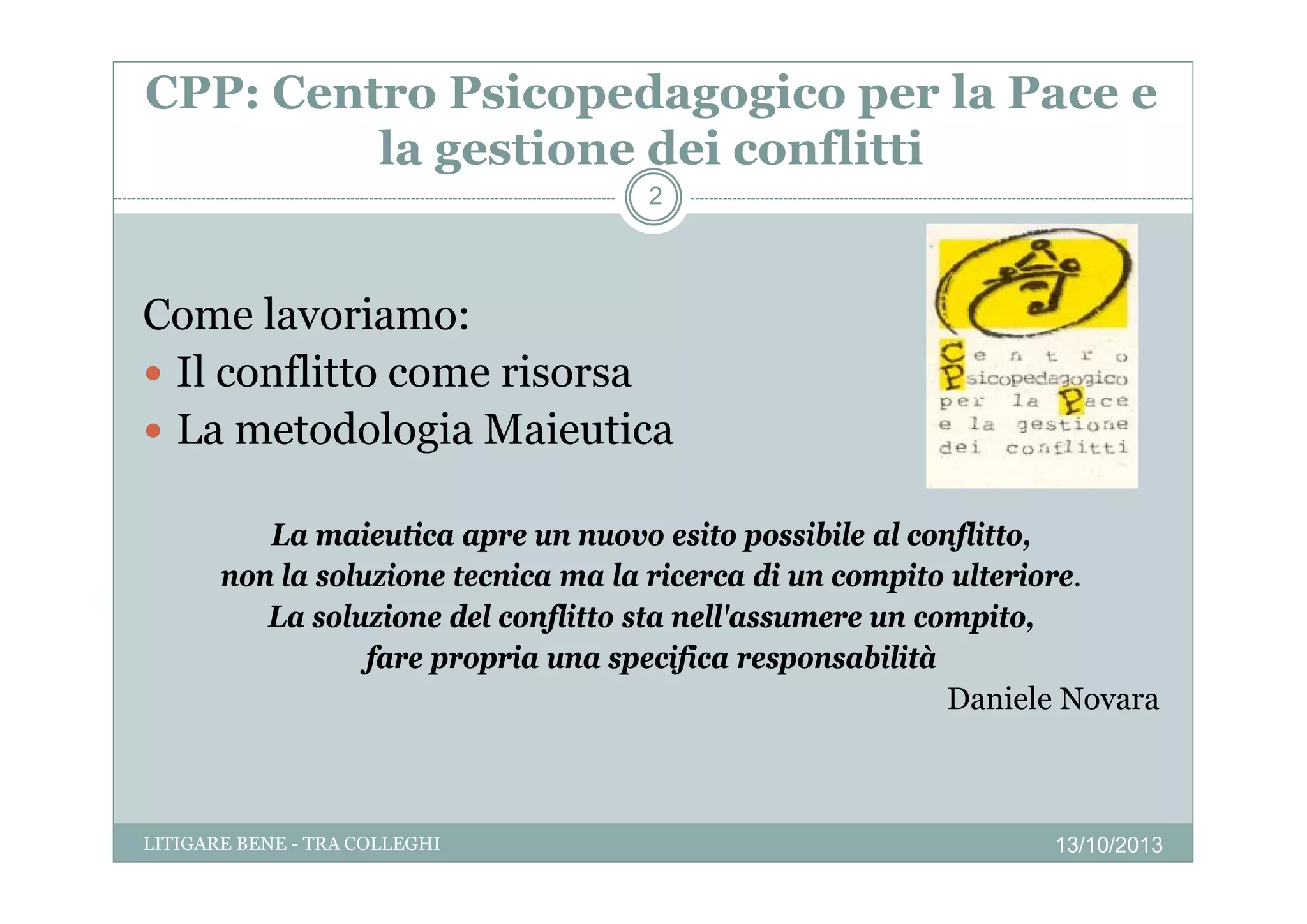 CPP: Centro Psicopedagogicoper la Pace e la gestione dei conflitti 2 Come lavoriamo:  Il conflitto come risorsa fli i  La metodologia Maieutica La maieutica apre un nuovo esito possibile al conflitto, non l soluzione tecnica ma l ricerca di un compito ulteriore. la l i i la i i l i La soluzione del conflitto sta nell'assumere un compito, f fare propria una specifica responsabilità p p p f p Daniele Novara LITIGARE BENE - TRA COLLEGHI 13/10/2013