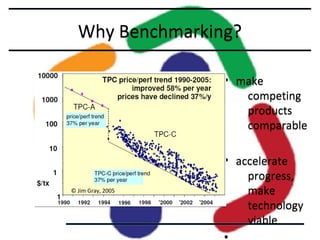 This document describes the LDBC Social Network Benchmark (SNB). The SNB was created to benchmark graph databases and RDF stores using a social network scenario. It includes a data generator that produces synthetic social network data with correlations between attributes. It also defines workloads of interactive, business intelligence, and graph analytics queries. Systems are evaluated based on metrics like query response times. The SNB aims to uncover performance choke points for different database systems and drive improvements in graph processing capabilities.