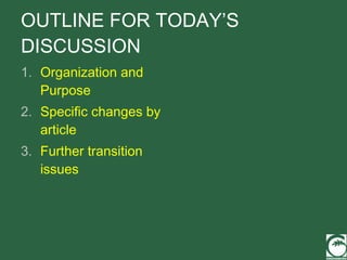 The document summarizes changes made to Greensboro, North Carolina's Land Development Ordinance (LDO). Key changes included reorganizing the ordinance to make it easier to find information, adding definitions, graphics and tables to improve readability, consolidating zoning districts and development standards, and introducing new mixed-use and infill development standards. A transition period and training sessions on the updated LDO are also outlined.