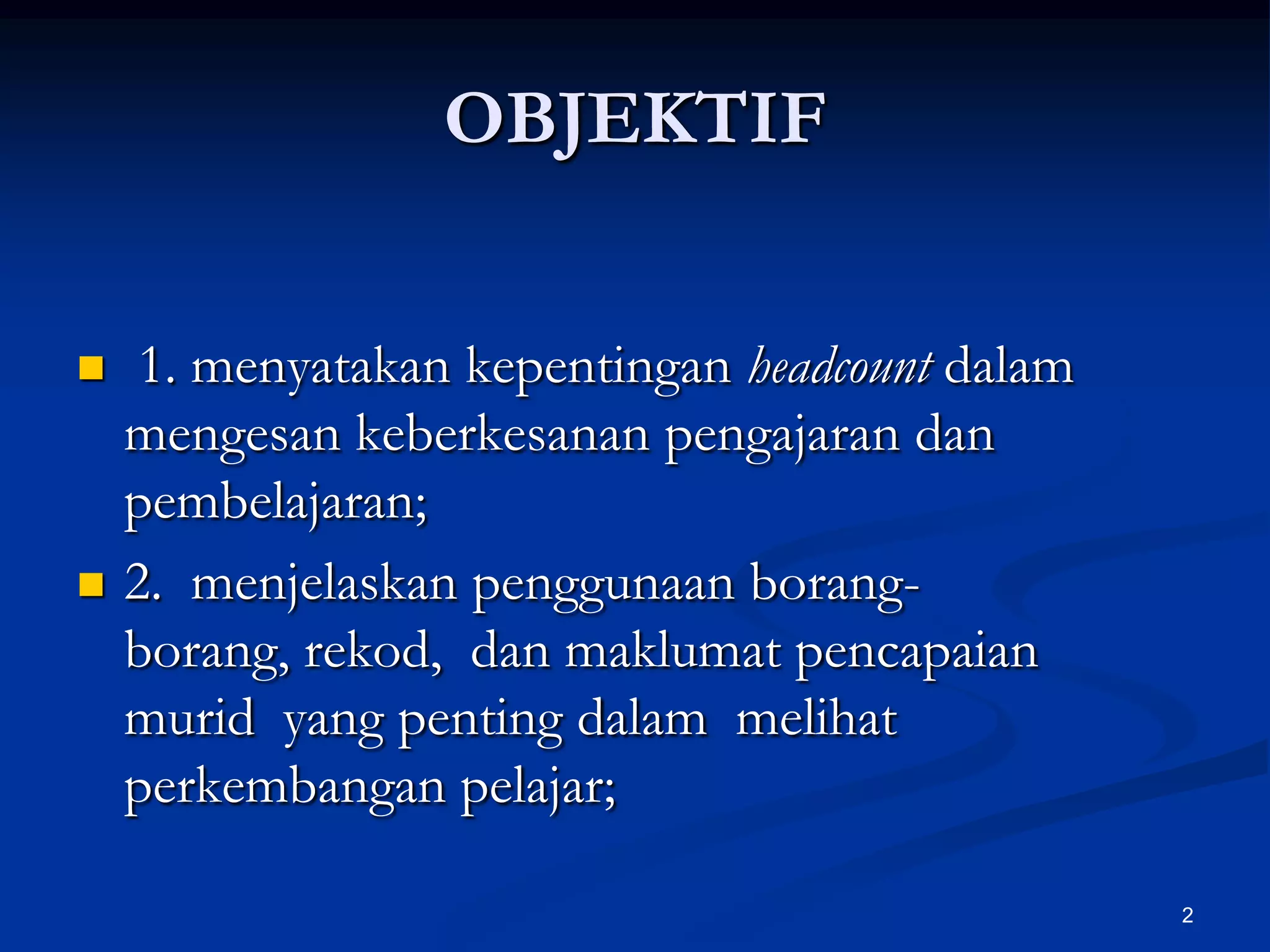 Dokumen ini membahas pentingnya proses headcount dalam mengenal pasti potensi akademik dan kerjaya pelajar dari tingkatan 1 hingga 5. Ia juga menjelaskan prosedur dan analisis data untuk merancang program penambahbaikan serta memantau pencapaian akademik berdasarkan sasaran yang ditetapkan. Tindakan post-mortem diadakan untuk mengukur keberkesanan pengajaran dan menyesuaikan strategi pembelajaran yang diperlukan.
