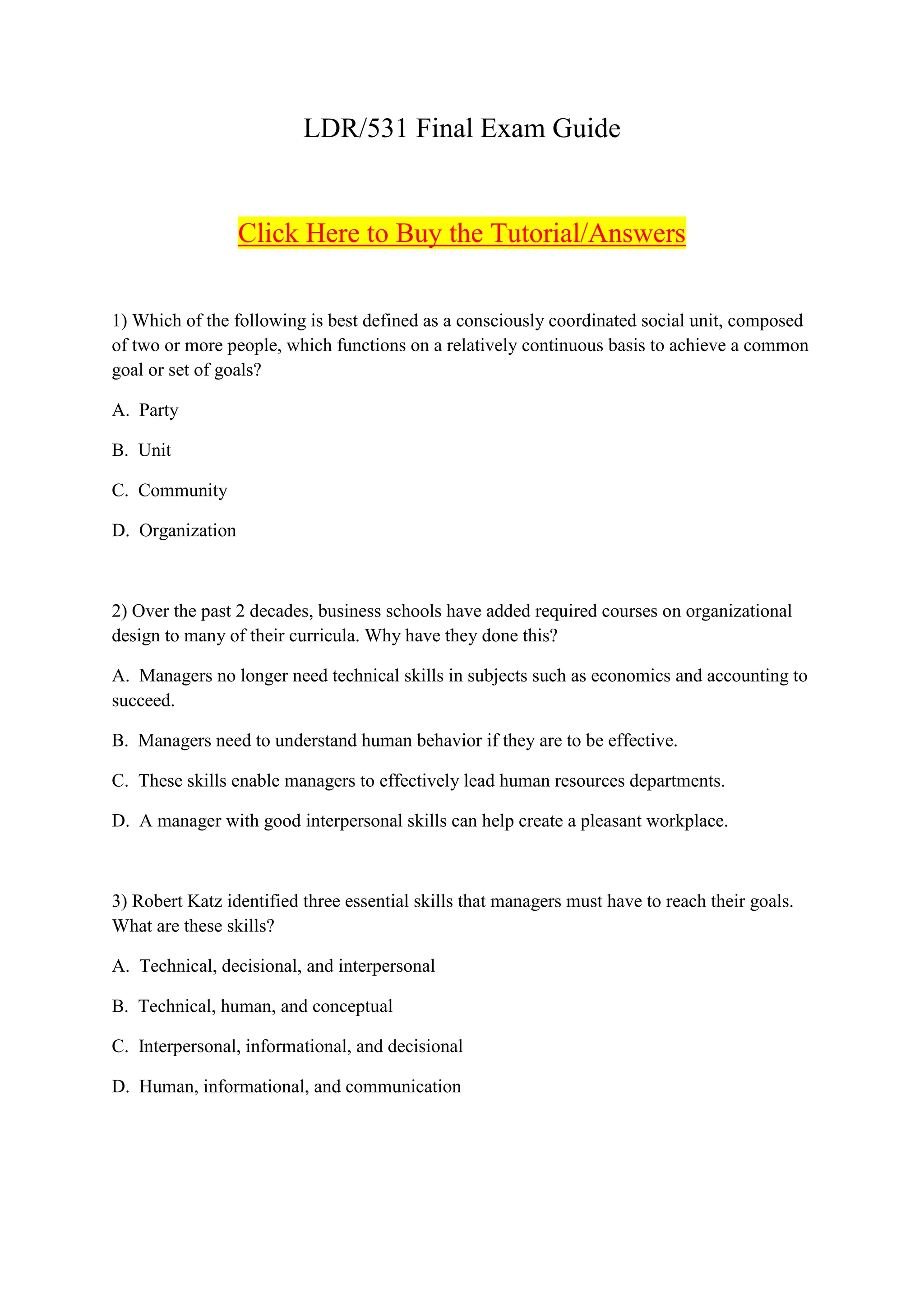 The document appears to be a study guide for a final exam in an organizational behavior course, featuring a series of multiple-choice questions covering key concepts and theories related to management and organizational dynamics. Topics include definitions of organizations, managerial skills, behaviors, personality traits, group development, and change management. It also discusses leadership styles and the importance of power within organizations.
