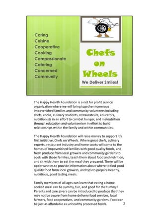 The document discusses the Happy Hearth Foundation's Chefs on Wheels Community Project. The project aims to combat hunger and malnutrition by bringing together families, volunteers including chefs and nutritionists, to cook and eat meals together. It teaches families healthy cooking, nutrition, and encourages volunteerism in community gardens. The goal is to help make nutritious food affordable and support communities in accessing and preparing good quality, healthy foods.