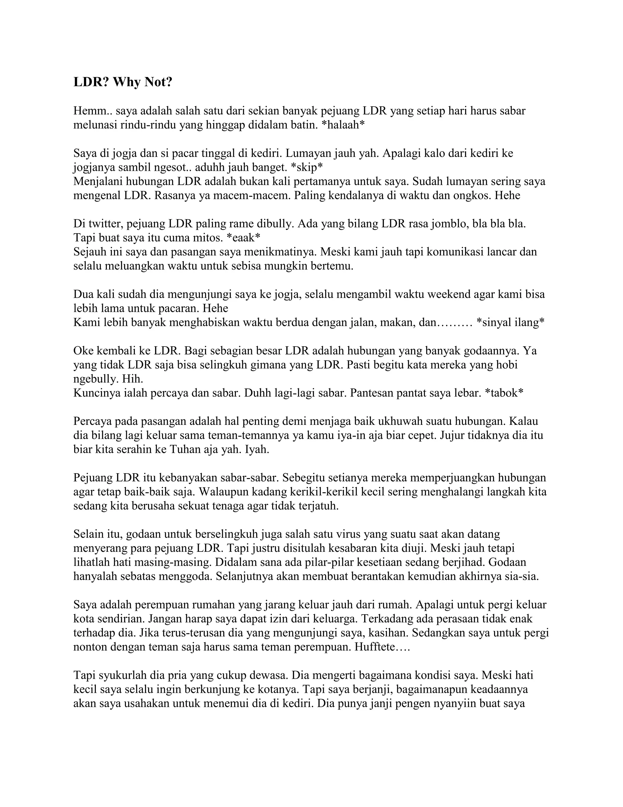 Penulis berbagi pengalaman menjalani hubungan jarak jauh (LDR) dengan pacarnya yang tinggal di Kediri, sementara dirinya di Jogja. Meskipun menghadapi tantangan seperti waktu dan ongkos, mereka tetap berkomunikasi dengan baik dan saling mengunjungi. Kunci untuk hubungan LDR yang baik adalah kepercayaan dan kesabaran, meskipun ada godaan dan keraguan yang sering muncul.