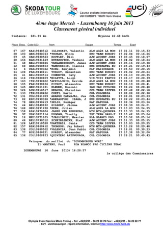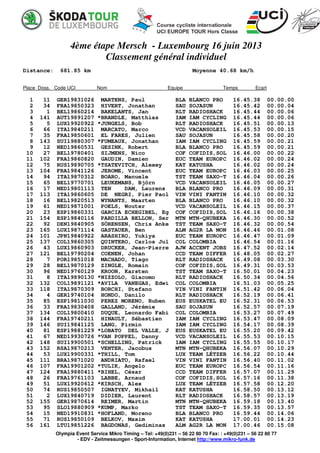 This document summarizes the results of the 4th stage of a cycling race from Mersch to Luxembourg on June 16, 2013. Paul Martens of the Blanco Pro Cycling Team won the stage with a time of 16 hours, 45 minutes, and 38 seconds. A total of 86 riders completed the 681.85 km stage with an average speed of 40.68 km/h. Martens also won the Luxemburger Wort jersey for the stage.