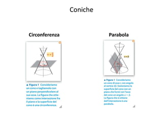 Le coniche sono curve ottenute dall'intersezione di un cono con un piano. Le principali tipologie di coniche includono la circonferenza, l'ellisse, la parabola e l'iperbole.