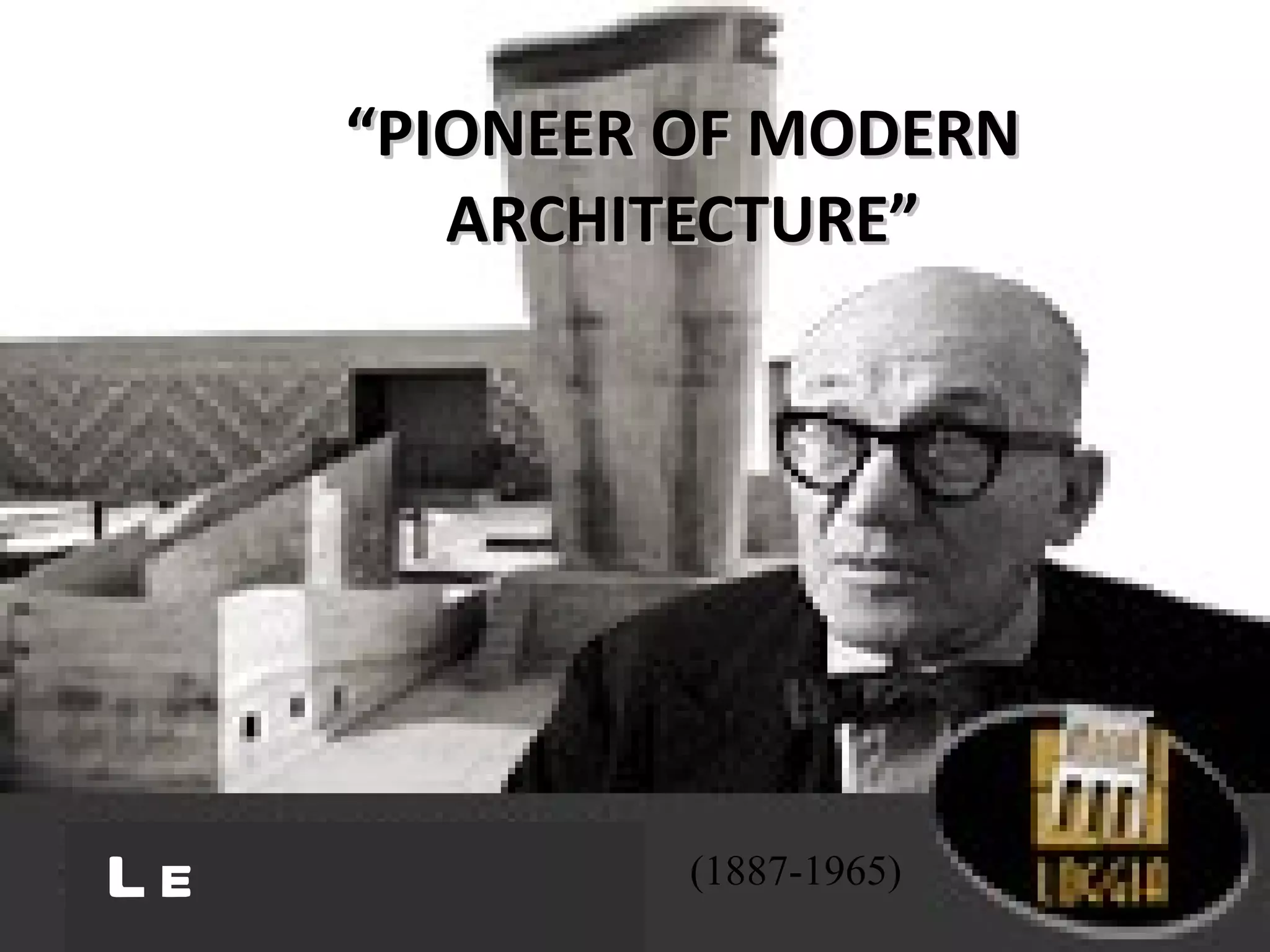 Le Corbusier, a Swiss-born French architect (1887-1965), significantly influenced modern architecture with concepts like the 'machine for living in' and the five points of architecture. His notable projects include the Unité d'Habitation in Marseille and the city planning of Chandigarh, where he employed reinforced concrete and innovative designs. He passed away in 1965 while swimming in the Mediterranean Sea.