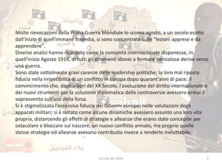 Il documento analizza le crisi globali del 2014, ponendo l'accento sull'emergere di conflitti regionali e la destabilizzazione dell'architettura di sicurezza europea. Si evidenziano le similitudini con la crisi del 1914, riguardo alla mal gestione politica e alla violazione delle norme internazionali, e viene discusso il crescente ruolo dell'Islam radicale e le tensioni tra sunniti e sciti nel contesto mediorientale. Inoltre, si sottolinea l'importanza di stabilire un partenariato equilibrato tra Russia e Occidente per affrontare le sfide geopolitiche attuali.