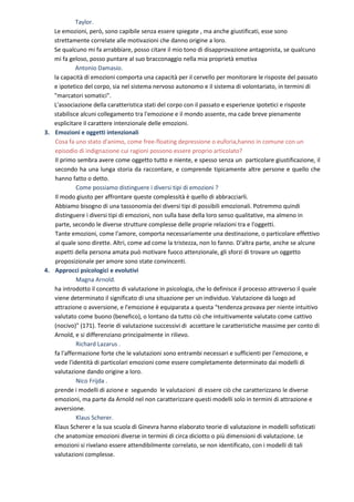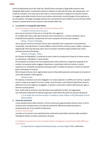 Il documento esamina le concezioni filosofiche e le teorie psicologiche delle emozioni, esplorando come queste si interfacciano con la mente, il corpo e il comportamento umano. Viene discussa l'evoluzione delle emozioni nei vari contesti teorici, dai modelli cartesiani e aristotelici fino alle teorie contemporanee di valutazione e cognizione. Infine, si evidenzia l'importanza delle emozioni sia come risposte soggettive che come componenti di interazione sociale, sottolineando la loro complessità e il loro ruolo multifunzionale.