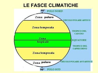 Il documento descrive le fasce climatiche della Terra, suddividendole in zona polare, zona temperata e zona tropicale, con riferimenti a specifiche aree geografiche e vegetazione. Viene fornito anche un link a ulteriori informazioni sul clima in generale e in Italia. La descrizione è accompagnata dall'invito a colorare e scrivere i nomi delle fasce climatiche.