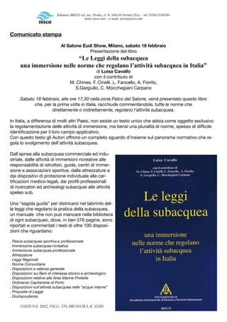 Il comunicato stampa annuncia la presentazione del libro "Le leggi della subacquea" di Luisa Cavallo al Salone Eudi Show di Milano il 18 febbraio. Il libro analizza e raccoglie le normative riguardanti l'attività subacquea in Italia, offrendo un quadro completo della legislazione che regola le immersioni, dalla pesca subacquea alle responsabilità degli istruttori. Con 576 pagine e oltre 100 disposizioni commentate, rappresenta una guida fondamentale per subacquei e professionisti del settore.
