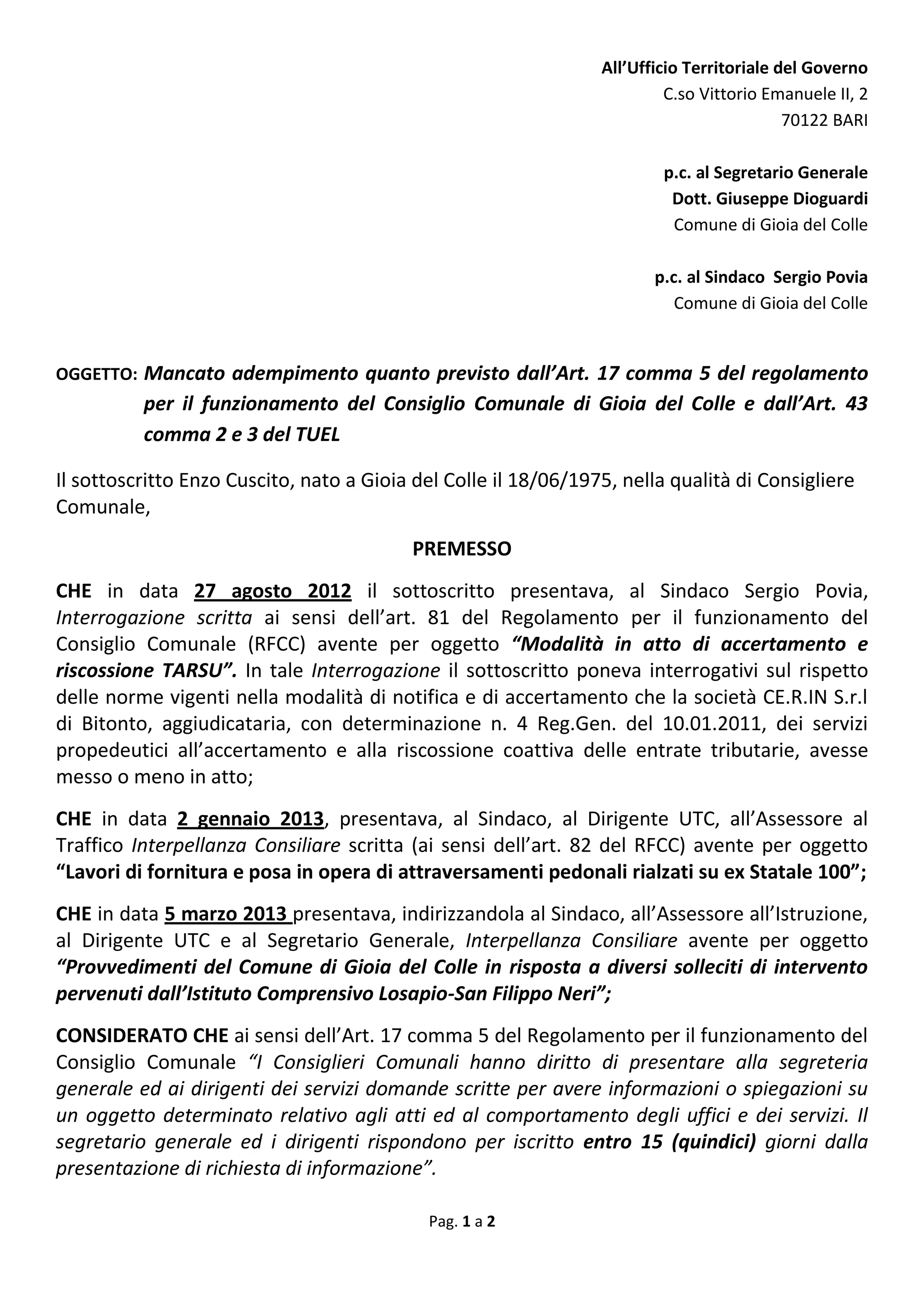 Il consigliere comunale Enzo Cuscito ha segnalato al Prefetto il mancato rispetto delle norme da parte dell'amministrazione comunale riguardo alle risposte alle interrogazioni presentate. Non avendo ricevuto risposte né scritte né verbali alle sue richieste dal 2012, Cuscito chiede intervento per garantire il rispetto dei diritti dei consiglieri. Inoltre, si solleva un dubbio sulla correlazione tra il silenzio dell'amministrazione e l'aggiudicazione del servizio di riscossione entrate alla società ce.r.in s.r.l.