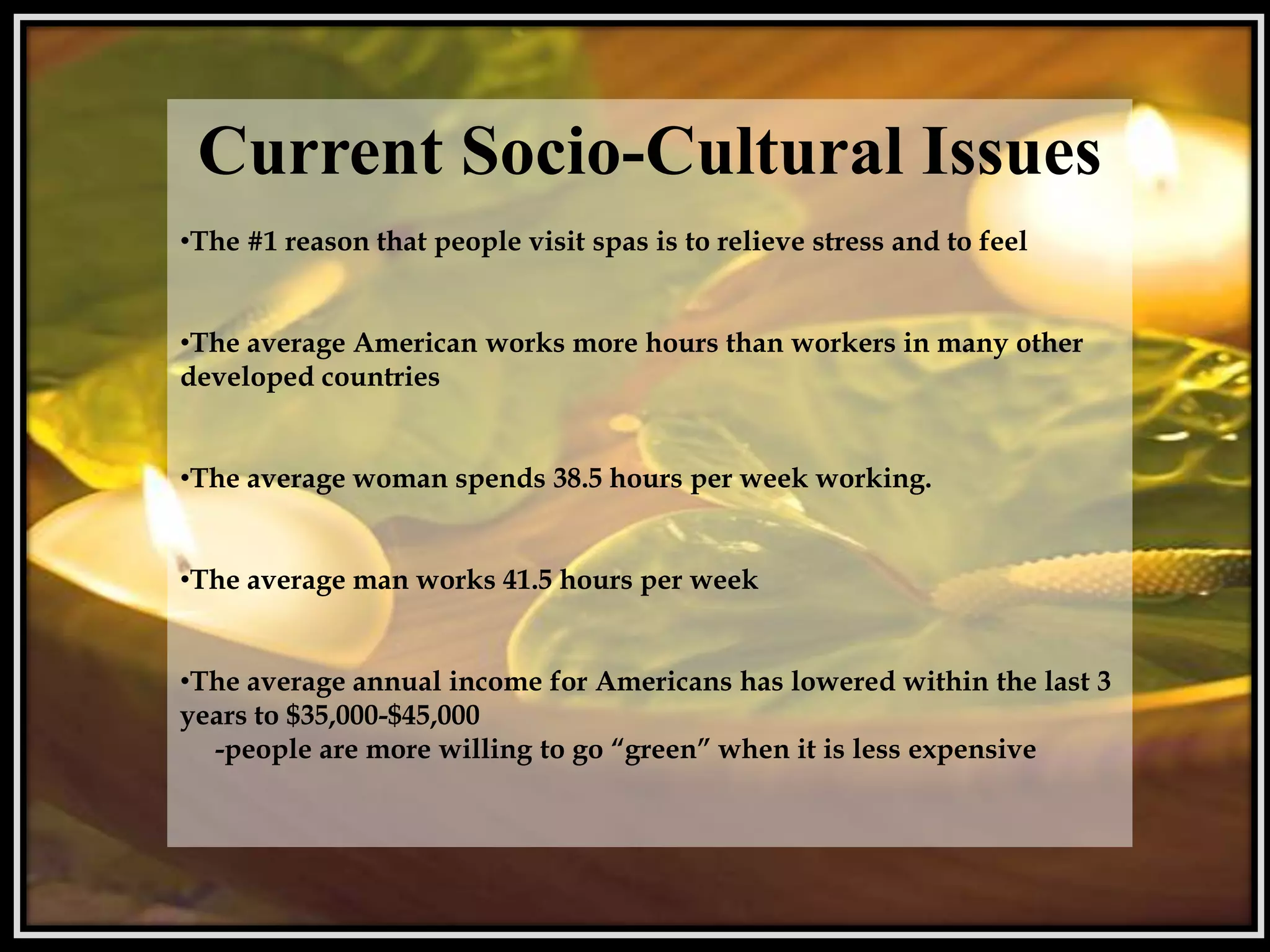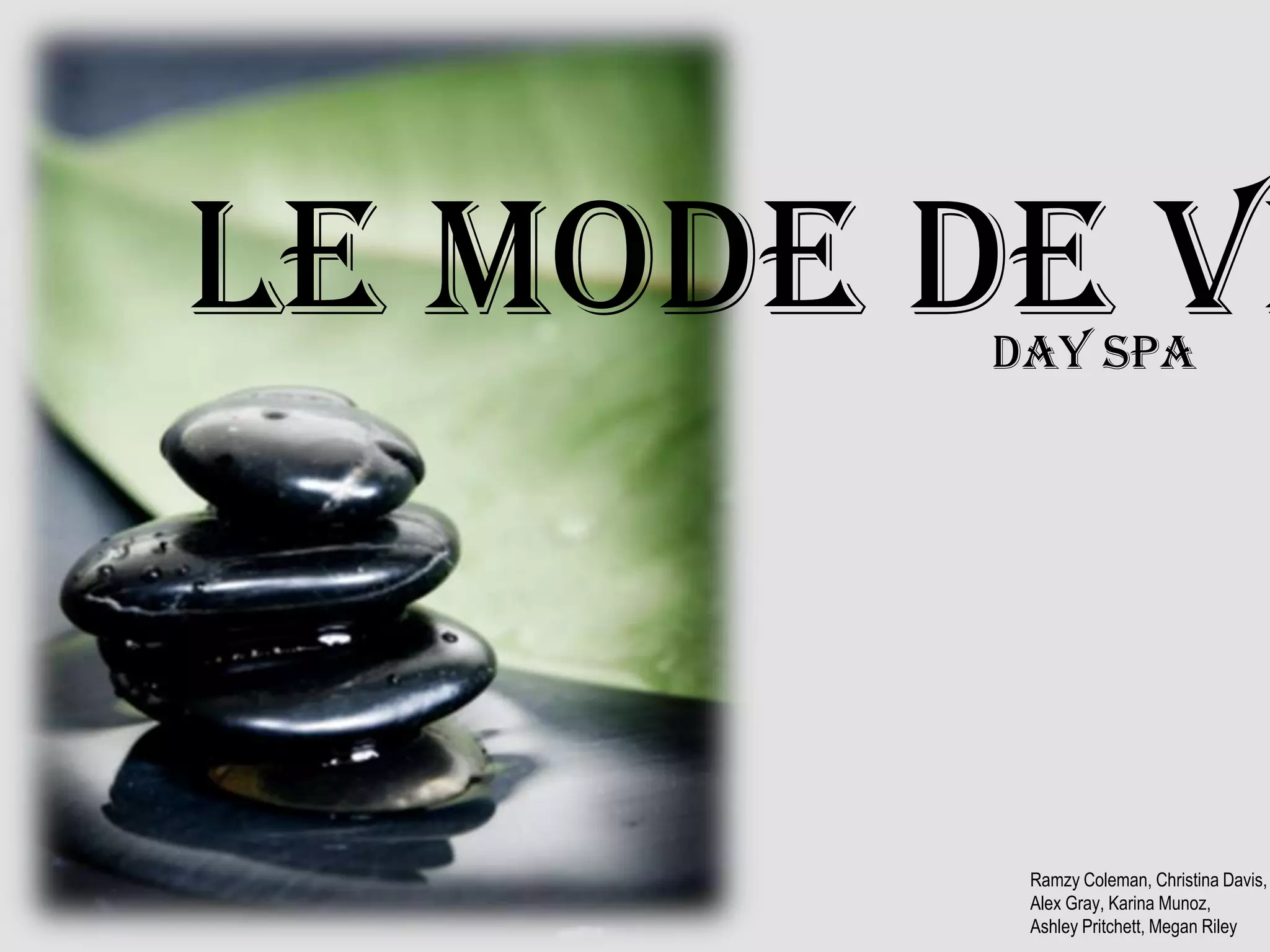 This document provides information about Le Mode de Vie, a proposed day spa. It discusses current socio-cultural trends favoring stress relief and eco-friendliness. The average American works long hours for $35,000-$45,000 annually. "Going green" is popular and the spa aims to be socially responsible using organic, chemical-free products and promoting recycling. It analyzes the target consumer group as environmentally-conscious, educated professionals and presents the spa's proposed brand positioning, services, and strategies to establish an eco-friendly brand.