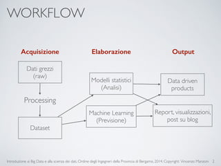 Il documento fornisce un'introduzione ai big data e alla scienza dei dati, coprendo argomenti come il machine learning, le sue tipologie (apprendimento supervisionato e non supervisionato) e la tecnologia Hadoop, fra cui strumenti come Hive e Pig per l'analisi dei dati. Viene anche trattato il cloud computing e servizi come ML as a Service per facilitare l'addestramento di modelli predittivi. Infine, vengono presentati esempi di applicazione e delle performance di diverse tecnologie per la gestione dei big data.