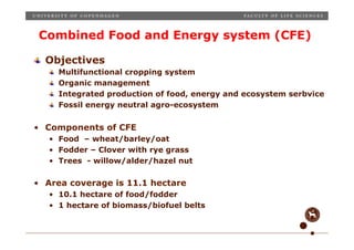 The document discusses climate-smart agriculture focusing on a Combined Food and Energy (CFE) system that integrates food, fodder, and biomass production on 11.1 hectares. It emphasizes the sustainability and economic value of ecosystem services, highlighting the CFE's potential to achieve fossil energy neutrality while providing essential agricultural outputs. The presentation advocates for a holistic assessment of economic, social, and ecological factors in fostering a sustainable society.