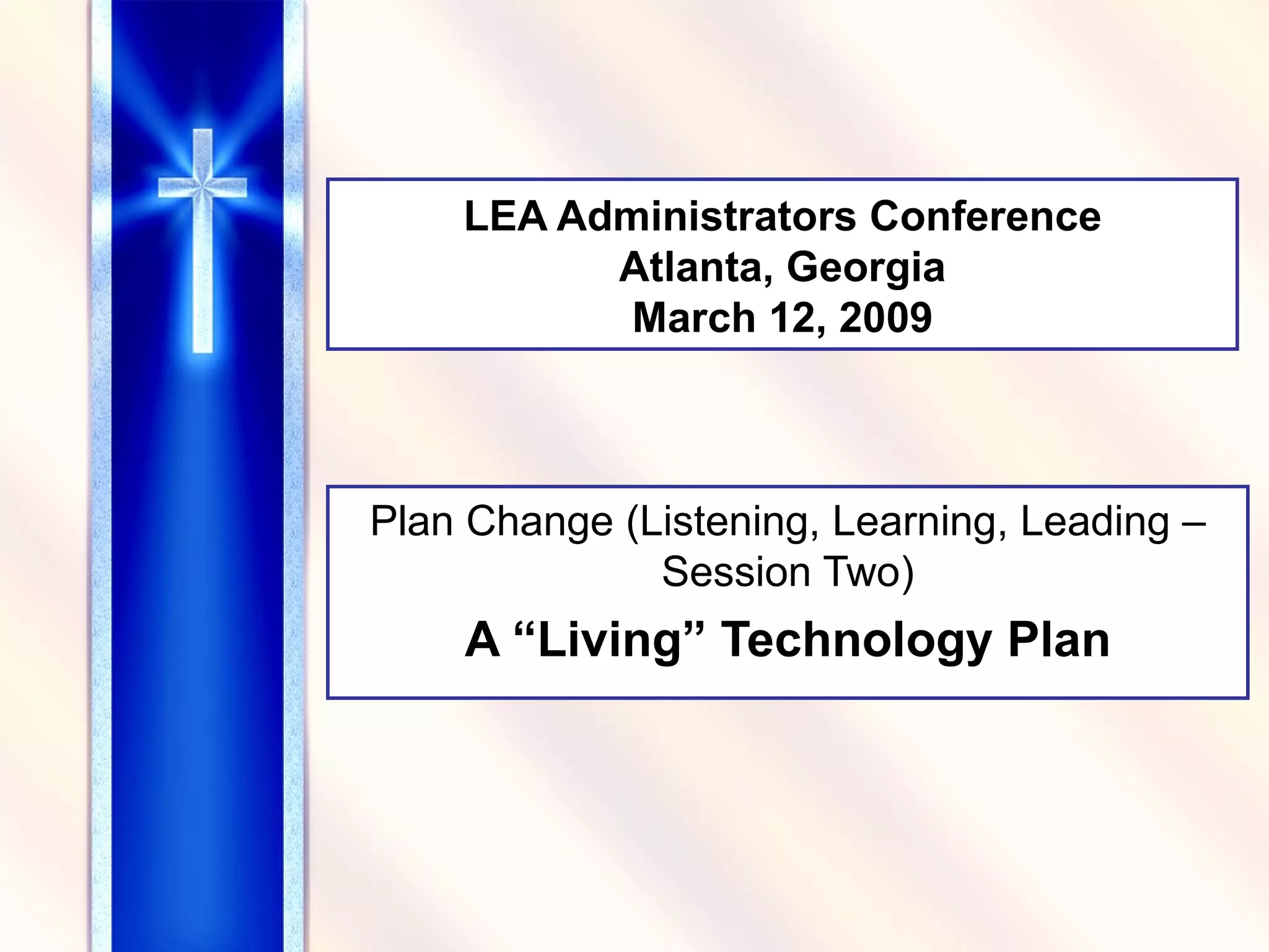 The document summarizes key points from a technology conference for school administrators. It discusses the increasing role of online learning, the need for technology training for teachers, and important elements of a comprehensive technology plan, including vision/mission statements, assessment of technology use, budgets, and documentation of hardware/software. Hybrid courses combining online and in-person learning are presented as an option. The importance of technology planning and having clear goals and outcomes is emphasized.