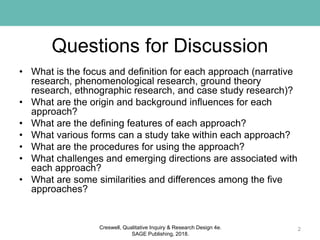 This document discusses five qualitative research approaches: narrative research, phenomenological research, grounded theory research, ethnographic research, and case study research. It provides definitions, origins, key features, types, procedures, challenges, and emerging directions for each approach. Some similarities and differences among the approaches are also examined, such as how they differ in their focus, goals, data collection and analysis processes. The document aims to help researchers decide which qualitative approach may be most suitable for their study.