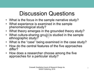 This document summarizes and provides examples of five qualitative research approaches: narrative study, phenomenology, grounded theory, ethnography, and case study. For each approach, a sample study is described that illustrates the key features and analytical process. The narrative study examines the experiences of a Chinese immigrant student. The phenomenology explores the lived experiences of individuals with AIDS. The grounded theory builds a theoretical model to explain physical activity among African American women. The ethnography analyzes how British Pakistani and Bangladeshi young men make sense of social and cultural exclusions. Finally, the case study provides an in-depth understanding of practices used by a teacher with students experiencing school failure.
