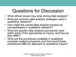 This document discusses qualitative data analysis and representation. It begins by outlining ethical considerations and general steps to analysis, including preparing, reducing, and representing data. Common data analysis strategies are described, such as those from Madison, Huberman & Miles, and Wolcott. The data analysis spiral process is explained through collecting, analyzing and reporting data in an iterative process. Specific analysis procedures are covered for each qualitative approach, including managing data, coding, developing themes, interpreting findings, and visualizing results. Computer programs that can assist with analysis are also reviewed.