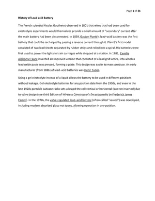 This document provides an overview of the lead acid battery manufacturing process. It discusses the key steps which include alloy production, grid casting, paste mixing and pasting, plate curing, and assembly. The alloy production process involves preparing mother alloy and KL-alloy from reclaimed lead using furnaces. Grids are then cast from the KL-alloy in grid casting shops using manual and automatic machines. The grids are quality checked for defects before moving to pasting where lead oxide paste is applied and cured. Finally, the plates undergo formation and are assembled into batteries.