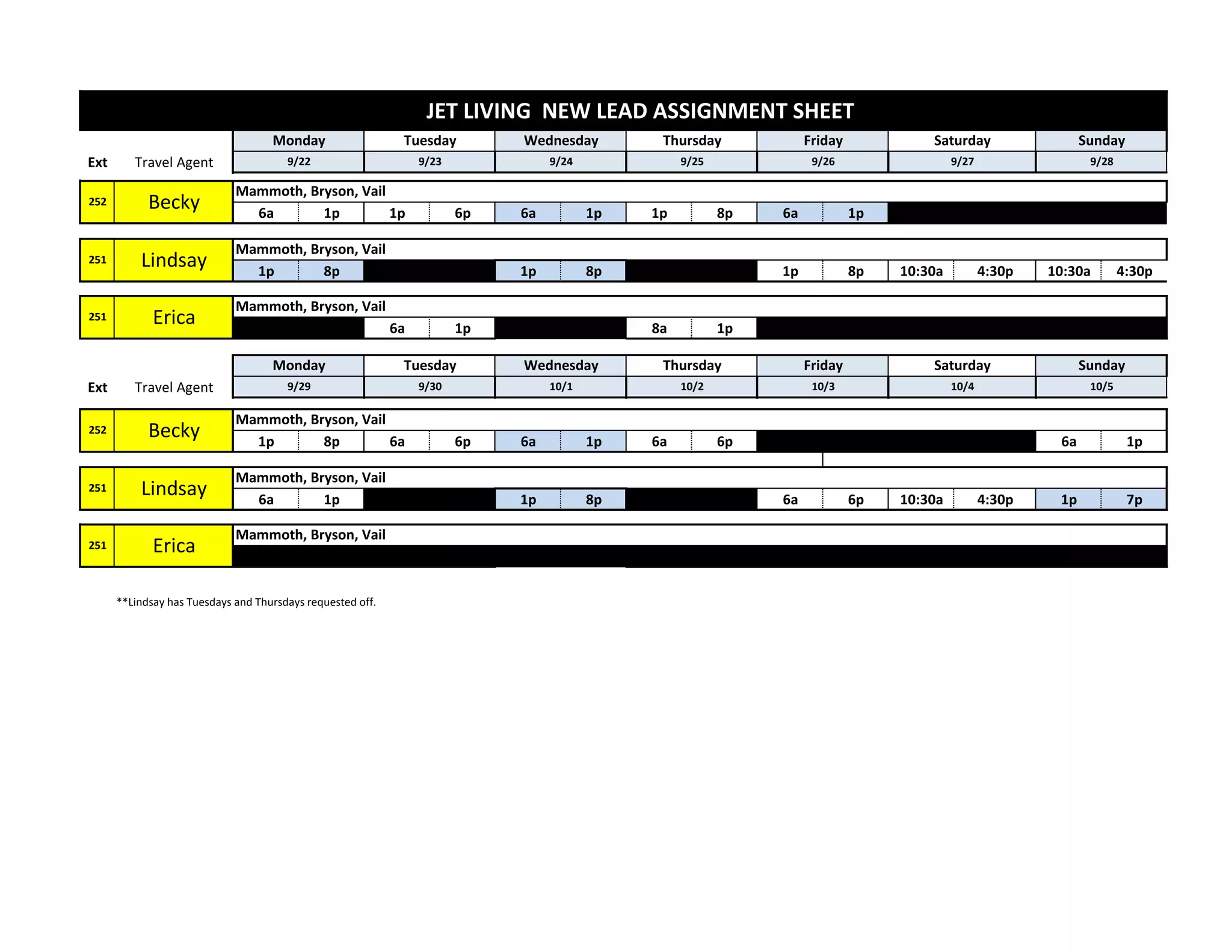 This document appears to be a travel agent schedule containing the names Erica, Lindsay, and Becky. It lists various dates from 9/22 to 10/5 and locations of Mammoth, Bryson, and Vail, possibly indicating trips or assignments for each agent. Lindsay has requested Tuesdays and Thursdays off. The document title is "JET LIVING NEW LEAD ASSIGNMENT SHEET".