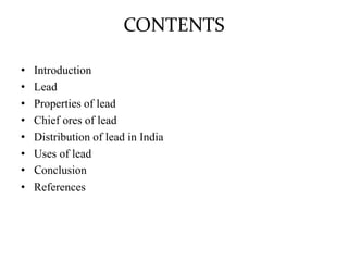 The document discusses lead deposits in India. It notes that 85% of India's lead deposits are located in Rajasthan, with major deposits found in Rampura-Agucha, Rajpura-Dariba, and Sindesar. It also lists lead deposits and occurrences in other states such as Andhra Pradesh, Jharkhand, Madhya Pradesh, Karnataka, Odisha, Gujarat, and West Bengal. The chief ores of lead discussed are galena, cerussite, and anglesite. Current uses of lead mentioned include lead-acid batteries, stained glass production, and fishing sinkers.