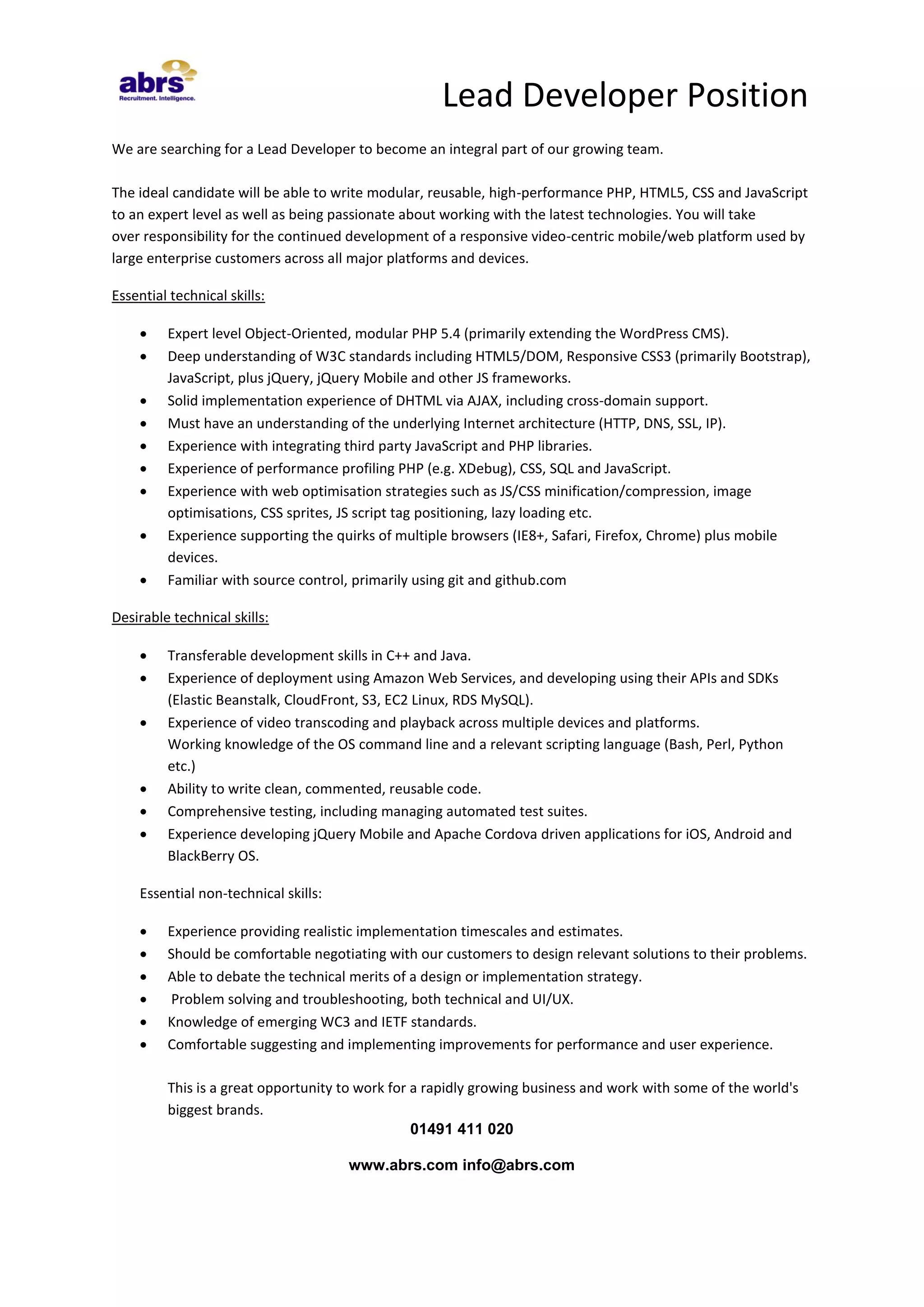 This job posting is looking for a Lead Developer to oversee continued development of a responsive video platform used by large enterprises. The ideal candidate has expert skills in PHP, HTML5, CSS, JavaScript and the latest technologies. Responsibilities include writing modular, reusable code and taking responsibility for the platform's development across devices and browsers. Essential technical skills listed include deep understanding of web standards, performance profiling, cross-browser support and version control. Non-technical skills include providing estimates, negotiating with customers, troubleshooting, and suggesting improvements.