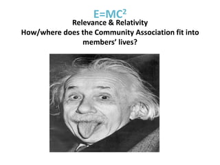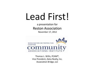 The document provides guidance on community association leadership. It discusses that effective leadership is important for an organization to succeed. It dispels myths about leadership, such as the idea that leaders are born rather than made. The document emphasizes that leadership requires ambition, competence, and integrity. It also stresses the importance of vision and communicating that vision to stakeholders in a meaningful way. Leaders are encouraged to engage in self-examination and evaluate how others relate to them. Overall, the document offers advice on developing leadership skills and providing effective guidance for a community association.