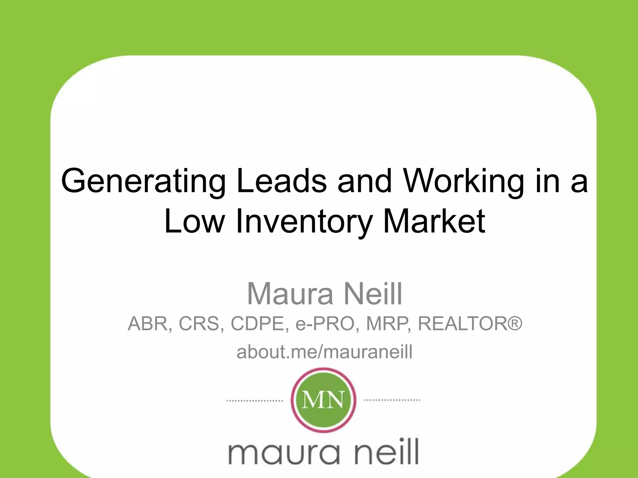 In a low inventory housing market, lead generation is key. Prospecting, farming, and networking can generate leads. Past clients, homeowners with equity, investors, and builders are good targets. Track which lead generation activities are most successful. Prepare buyers for multiple offers by educating them on market data like absorption rate. Sellers should discuss a multiple offer strategy and agree to terms before listing. Buyers can make offers stand out through creative terms like escalation clauses or fewer contingencies.