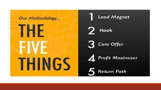 This document discusses different types and channels of website traffic. The main types are paid, social, referral, and organic traffic. Paid traffic comes from ads on platforms like Google AdWords and banners. Organic traffic results from search engine optimization. Referral traffic originates from other sites linking to the website. Social traffic is generated through ads on Facebook and LinkedIn. The document also mentions various marketing strategies like using lead magnets, hooks, core offers, upsells, cross-sells, and exit offers to maximize profits through return visitors.