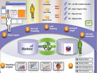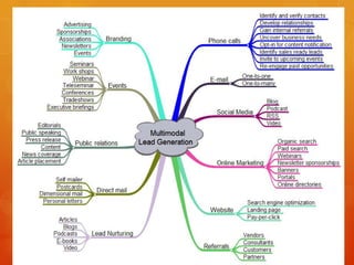 This document discusses lead generation and sales processes for complex sales. It outlines four types of sales: active, passive, direct, and indirect. The sales process involves prospecting and lead generation, qualifying prospects, setting appointments and presentations, assessing requirements and addressing objections to close the sale. Lead qualification considers both implicit factors like website activity and explicit factors like a company's details, location, industry, and previous sales history. The goal is to provide concise overviews of lead generation models, buying processes, and sales qualifications for complex sales.