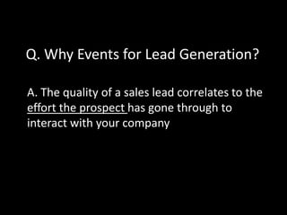 Event marketing can generate high-quality sales leads if done properly. There are 10 critical success factors for lead generation through event marketing: 1) Give yourself enough time to plan the event, 2) Set realistic targets based on your contact database, 3) Plan your budget with a 10% contingency, 4) Choose the right venue, 5) Deliver valuable content for your audience, 6) Plan audience generation effectively using various communication tactics, 7) Create a project plan with tasks and deadlines, 8) Plan your lead capture mechanism, 9) Ensure smooth execution through planning and team preparation, and 10) Follow up on leads effectively and prioritize feeding them into your sales pipeline.