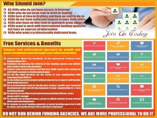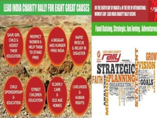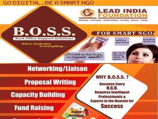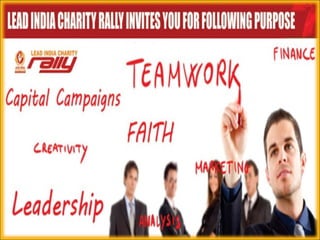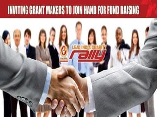 Lead India Foundation is a nonprofit organization that works to promote and support other nonprofit organizations across India. It plays an advisory role to governments and international organizations. Lead India Foundation helps connect NGOs to funding opportunities and provides a unified voice for nonprofits. It was founded in 1991 and aims to study and promote effective management practices for nonprofits.