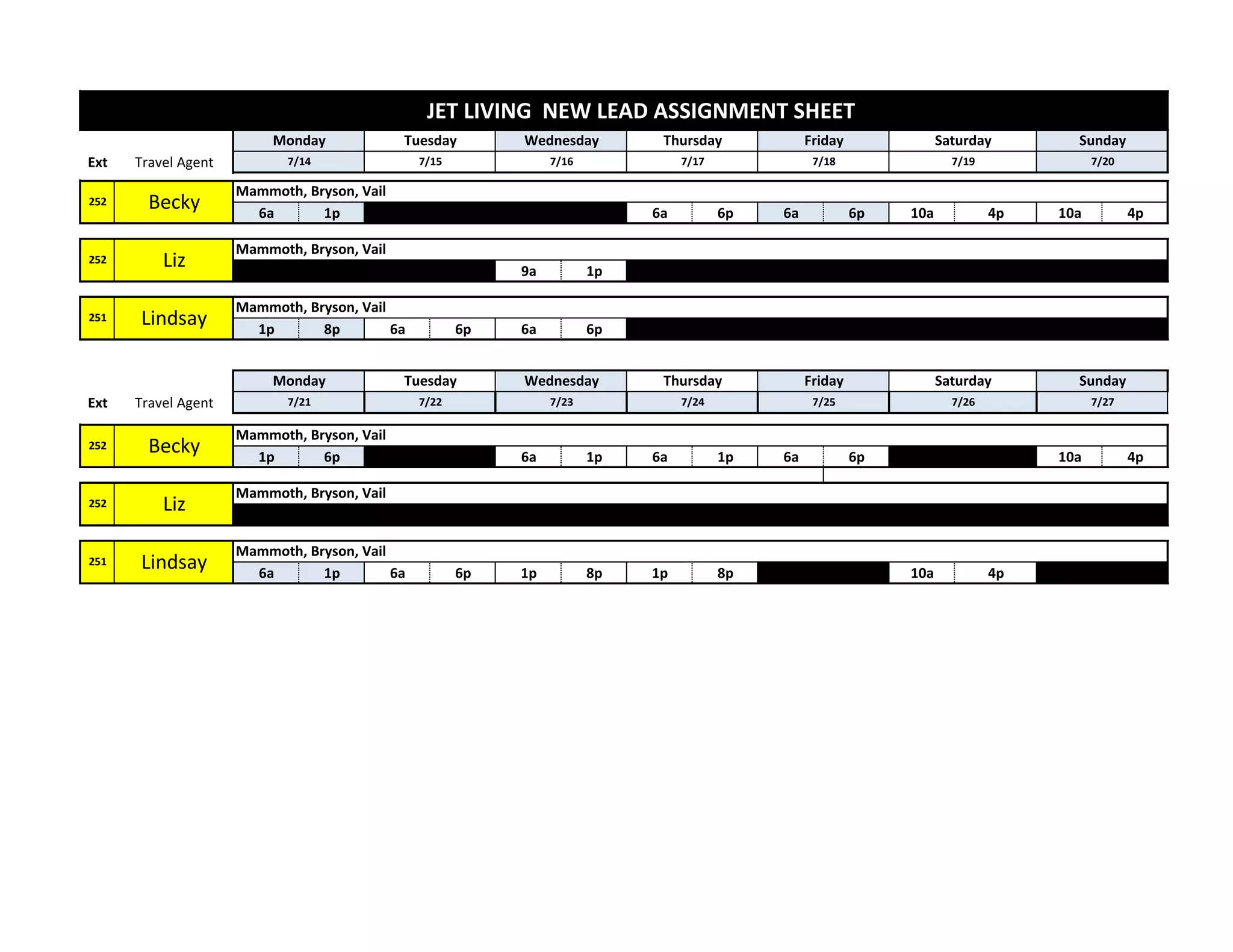 This document contains a travel agent's schedule and assignments for three agents over two weeks. It lists the agents' names, destinations they are responsible for, and their daily schedules, which include arrival and departure times. The destinations are Mammoth, Bryson, and Vail.