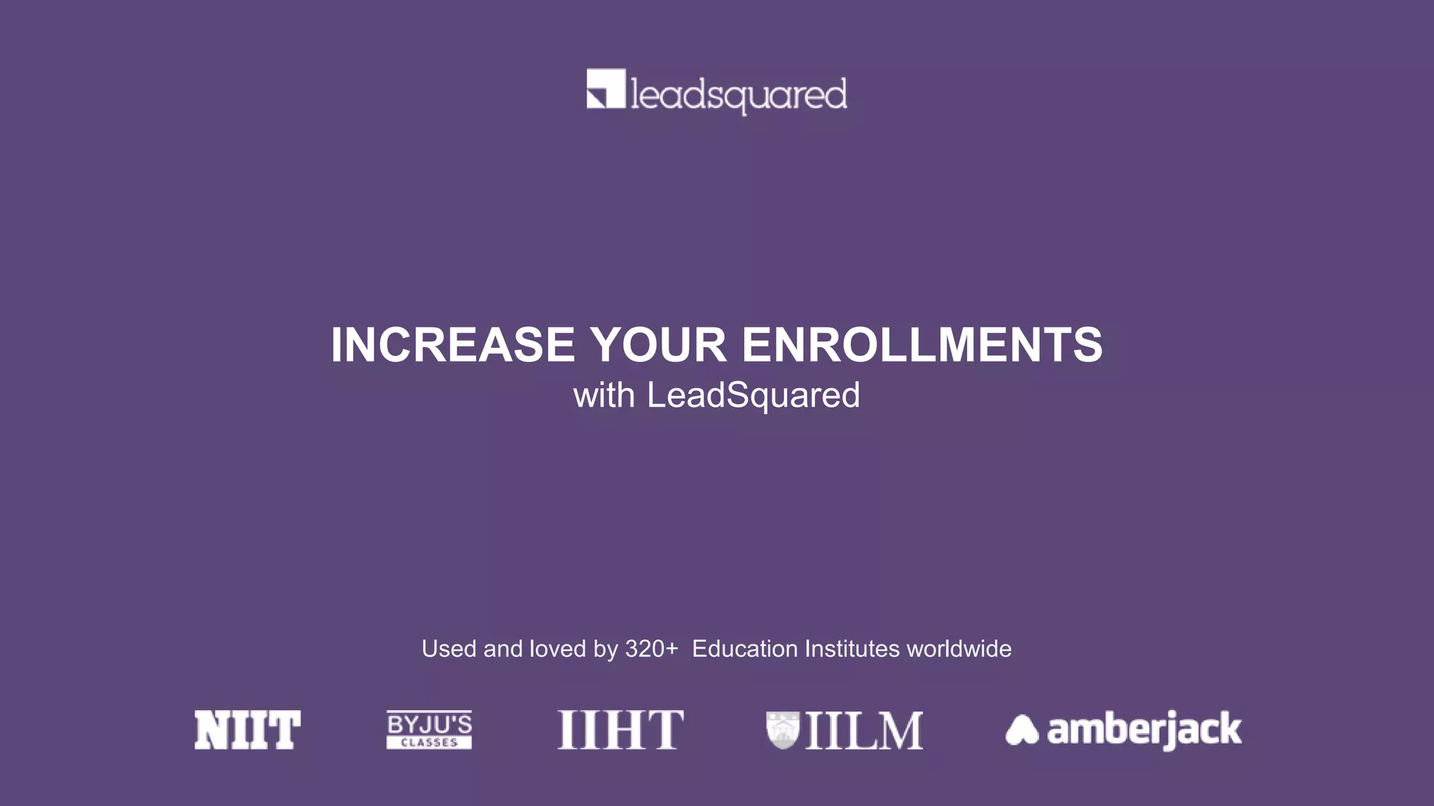LeadSquared helps education institutes increase enrollments by 40-50% by capturing leads from multiple sources, nurturing them with personalized campaigns, and automating follow-ups. It allows tracking lead behavior and activity to prioritize contacts and understand what marketing efforts are most effective. Metrics and business intelligence are provided to improve ROI.