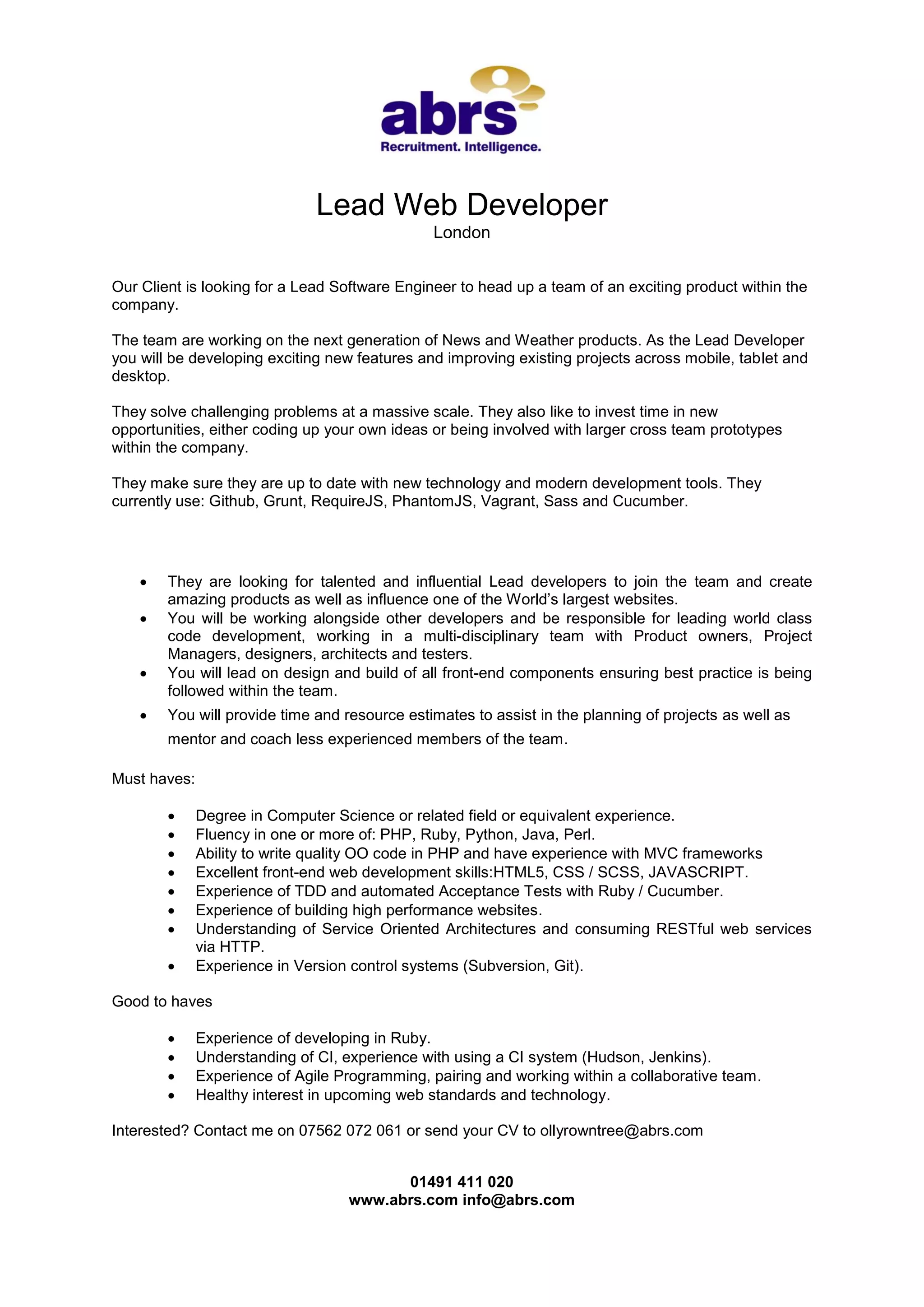The client is looking for a Lead Developer to head a team developing the next generation of news and weather products across mobile, tablet, and desktop. As Lead, the candidate will develop new features, improve existing projects, solve challenging problems at scale, and mentor less experienced team members. The role requires strong front-end skills in HTML5, CSS, JavaScript, as well as back-end skills like PHP, Ruby, or Python and experience with frameworks, testing, version control, and Agile methodologies.
