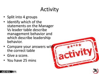The document outlines an activity where groups must identify statements from a table as describing either manager or leader behaviors. The groups are given 25 minutes to complete the task and compare their answers to a key. The table lists 27 statements and the document provides definitions of a manager and leader. A manager controls or directs people and resources, while a leader leads people to achieve common goals.