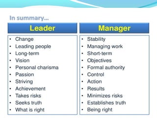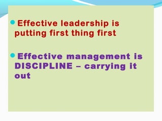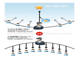 The document discusses the differences between leadership and management. It states that effective leadership involves putting the right things first and effective management involves discipline and carrying things out. Leaders have followers and focus on people, while managers have subordinates and focus on work. The document also outlines different leadership styles and compares the roles of leaders and managers. It notes that leadership and management must be complementary and that the most effective managers are also leaders.