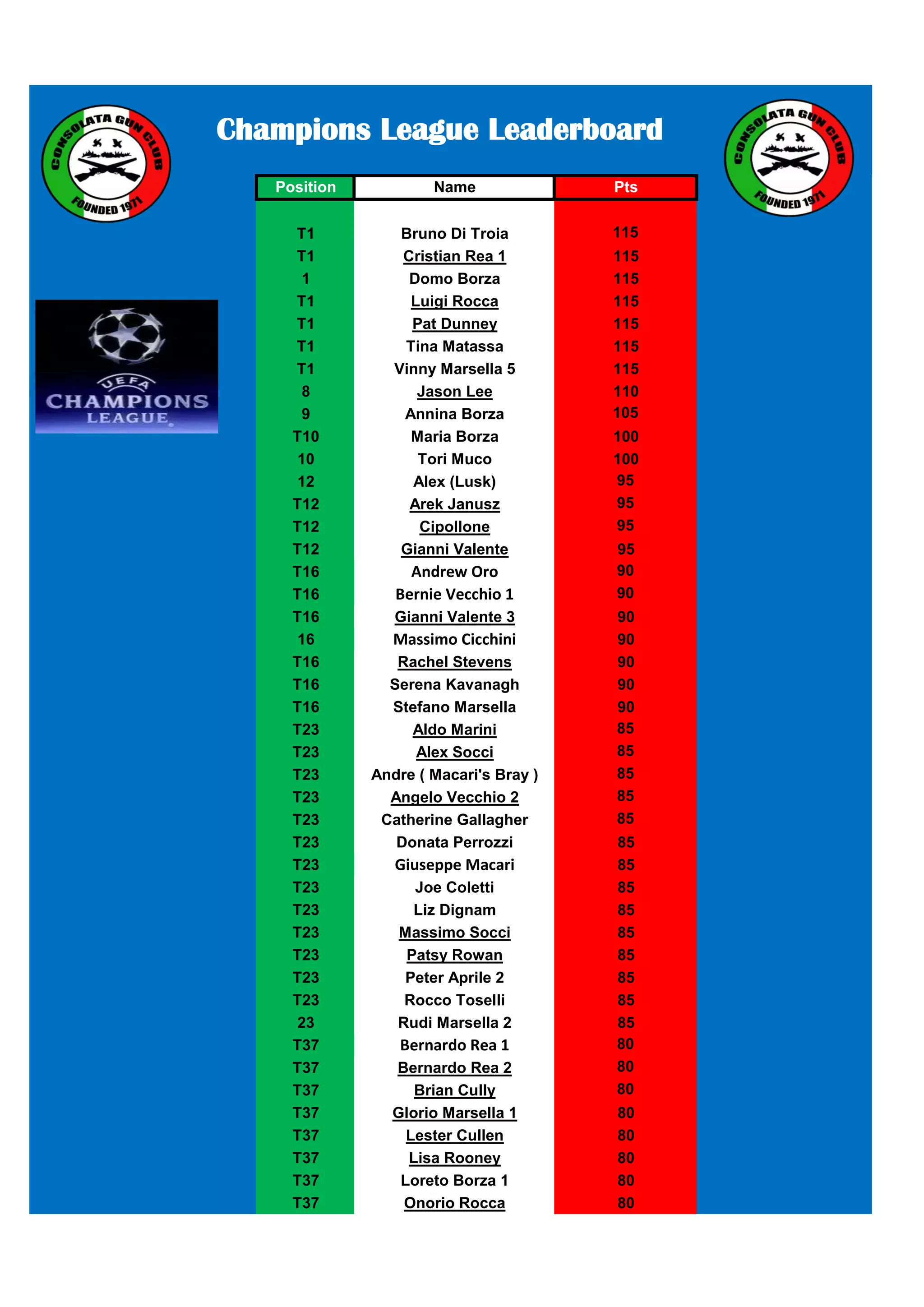 The document shows a leaderboard for a Champions League competition. It lists 184 participants ranked by their total points, with ties listed together. The top participant, Bruno Di Troia, has 115 points, tied with 6 others. The bottom participant, Tony Breadman (Kill), has 5 points.