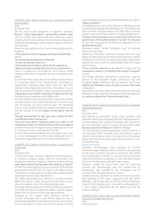 Nissan announced five key criteria for selecting sports sponsorships at the Leaders in Sport conference, emphasizing the value of global media exposure and emotional connection in automotive marketing. Allianz's Christian Deuringer discussed the company's strategic approach to stadium naming rights, while Heineken's Hans-Erik Tuijt expressed a desire for the European rugby competitions to expand. Additionally, industry leaders shared insights on effectively leveraging digital channels, engaging social media content, and the evolving landscape of sports sponsorships.