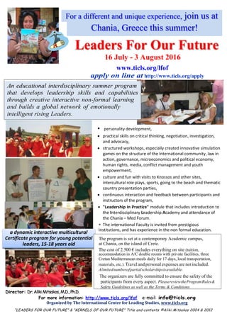 The document advertises the "Leaders For Our Future" summer program held in Chania, Greece from July 16 to August 3, 2016. The program is designed for potential young leaders ages 15 to 18 and focuses on personality development, practical skills like critical thinking, and workshops on topics like human rights, economics and conflict management. Participants will visit historical sites, engage in cultural activities, and receive continuous feedback from instructors. The cost of 2,500 euros covers tuition, accommodations, meals and transportation for the 17-day program. A limited number of partial scholarships are available.