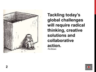 This document summarizes a presentation on leadership in complex times. It discusses trends like an aging population, declining funding, and increased use of technology that are challenging non-profits. It also covers different types of change and resistance to change. The presentation argues that leadership must acknowledge complexity, be inclusive and adaptive to navigate these challenges. Qualities like identifying different problem types and fostering collective wisdom are important. The goal is a shift to see communities as primarily responsible for members' well-being, with professionals and funders playing supporting roles.