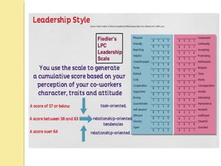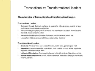 The document discusses various leadership theories and traits, highlighting the distinction between leadership and management, with effective leadership focused on vision and inspiring change. It addresses trait, behavioral, and contingency theories, emphasizing traits such as honesty, integrity, and decision-making skills as important for leaders. Additionally, the document outlines the significance of trust in leadership and the characteristics of both charismatic and transformational leadership styles.