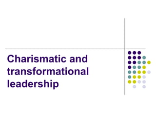 The document discusses charismatic and transformational leadership. It defines charismatic leadership as leadership with divinely inspired gifts that inspire confidence. Charismatic leaders are more effective during times of crisis when people seek bold solutions. Transformational leadership builds on charismatic leadership by stimulating new perspectives and encouraging followers to challenge existing views, including those of the leader. An appealing vision is a key part of initiating and guiding organizational change.