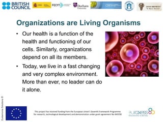 3) Both individuals and organizations progress through levels of development from basic survival needs to serving a higher purpose of making a positive difference in the world. The document provides frameworks for assessing individual and organizational development levels.