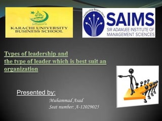 This document discusses different leadership styles including autocratic, democratic, laissez-faire, bureaucratic, and transactional/transformational. It defines a leader as someone who guides others toward a common goal by example. Characteristics of a good leader are listed as respectful, flexible, good communicator, well-educated, organized, consistent, and takes initiative. For an organization with a narrow span of control, an autocratic leader may be most appropriate as decisions can be made quickly and efficiently, though staff may resent this style. The best leadership style depends on factors like commitment, competence, cooperation and the leader themselves.