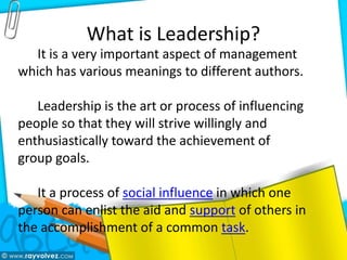 The document discusses leadership and defines it as the art or process of influencing people so that they will strive willingly and enthusiastically toward the achievement of group goals. It distinguishes leadership from management, noting that leadership involves inspiring and motivating followers rather than just directing them. The document also examines various theories of leadership, styles of leadership, traits of effective leaders, and what makes leadership necessary in an organization.