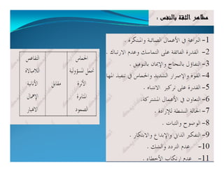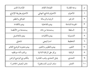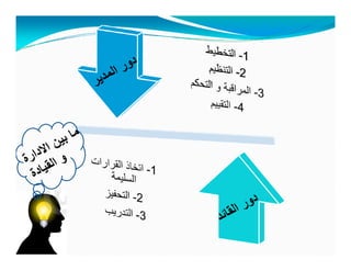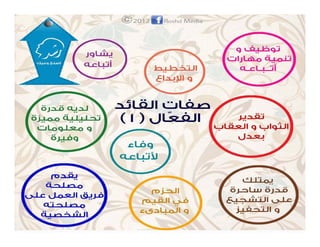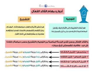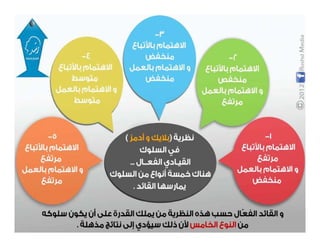 تتناول الوثيقة أساليب القيادة الفعّالة التي تجمع بين العطف والحزم، والتواصل الجيد مع الفريق لتحقيق الأهداف. تشير إلى أهمية الفهم والتفاعل الإيجابي مع الأفراد أثناء العمل الجماعي، واستخدام التحليل لتحديد الأهداف وتحقيقها. كما تبرز أنماط القيادة المختلفة وتأثيرها على الأداء العام للفريق.